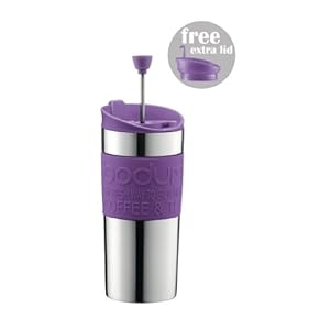 Discount the Bodum K11067-278 TRAVEL PRESS SET Coffee maker with extra lid, vacuum, small, 0.35 Ltr., 12 oz, s/s Purple